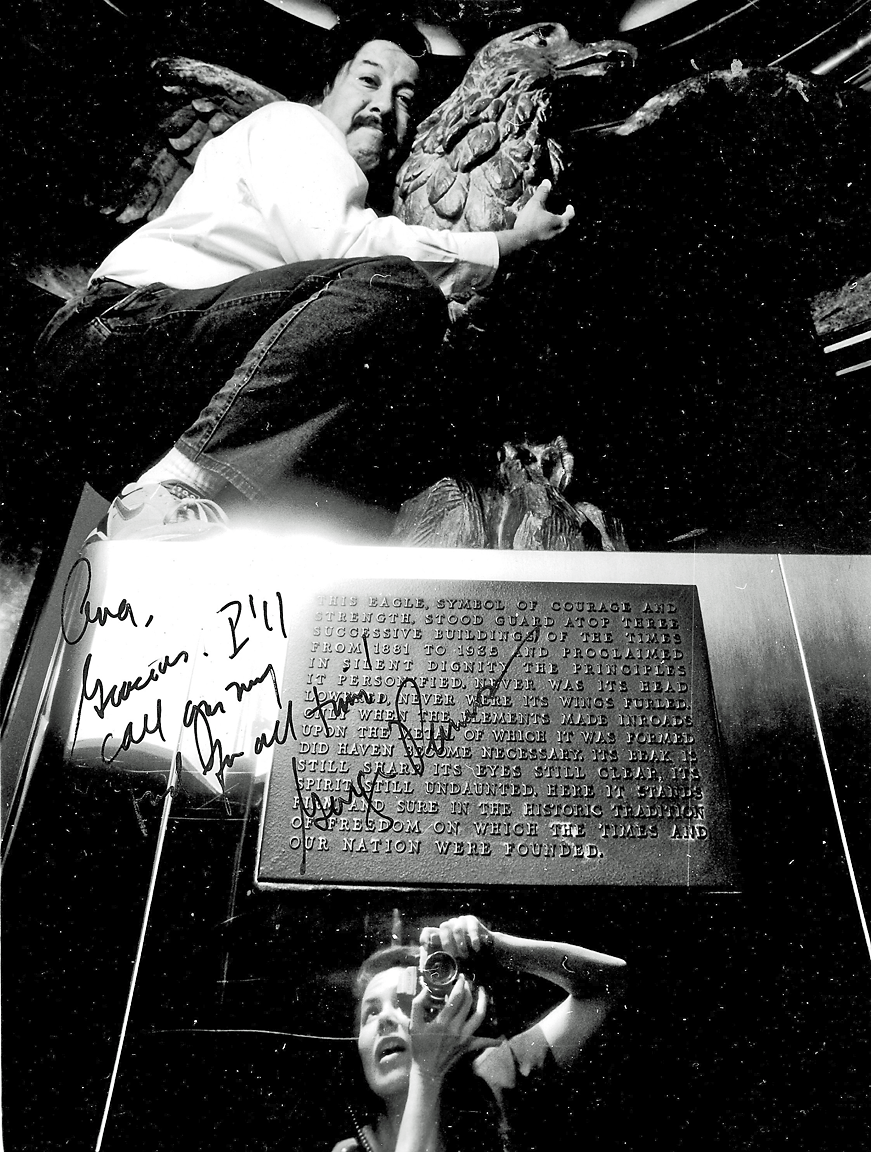 Thats George hugging the eagle in foyer at Times Mirror Square, downtown Los Angeles – and thats me with the camera. George was receiving another accolade and he asked me to photograph him. While I cannot remember at this moment the particular award, I can say, he had many – three Pulitzer Prizes, among other local and national awards. George was the first Chicano to win a Pulitzer Prize Gold Medal for Meritorious Public Service.
