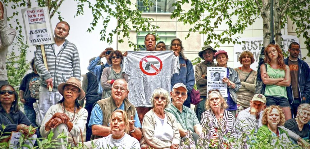 (l-r) Two friends speaking: Ahoua of Seattle: I’m here to demand justice for Trayvon. To keep his name alive. I have two young boys of my own. Trayvon did nothing wrong. I do not want him to be forgotten” Holding the flag is Gwen of Seattle” “I’m here because we need accountability. He is dead. This child did nothing wrong. I have granchildren. Are they next? We are all the same. We’ve all come together, sorry we here again.”