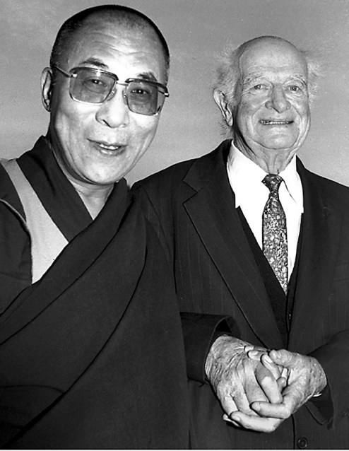 | His Holiness the Dalai Lama with two-time Nobel Laureate Linus Pauling, during a private reception hosted by the Nuclear Age Peace Foundation, Santa Barbara, California. Photograph copyright Ana Elisa Fuentes. It may not be used without my permission. |