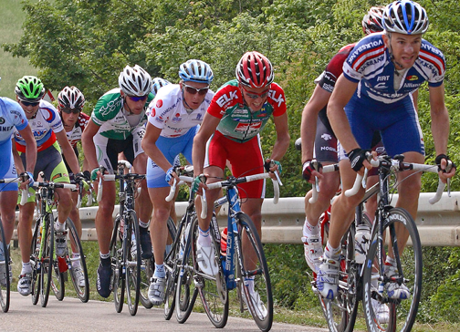 Climbing stage, day two in Eichstätt, fourth from front, in the white jersey, Fabian Wegmann of Team Gerolsteiner, Thomas Rohregger of Team Elkhaus-Simplon. and leading the pack in blue, Pascal Hungerbühler of Team Volksbank