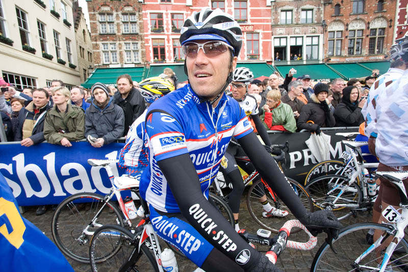Matteo Tosatto of Team Quick Step prepares for the Tour of Flanders start on market square Brugges, Belgium, on Sunday April 04, 2010.