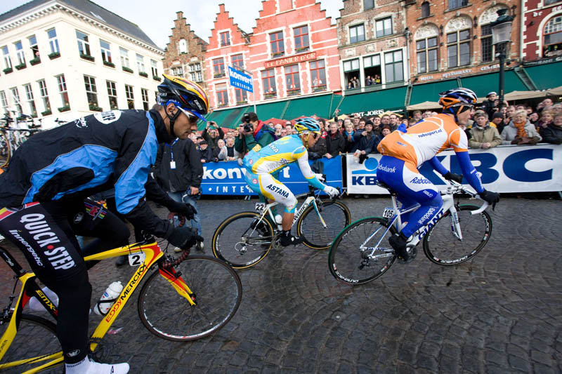 | At the start in Brugges are (L-R) Belgian rider Tom Boonen (on his signature Eddy Merckx bicycle), of Team Astana number 22 Allan Davis, and Belgian Nick Nuyens. |